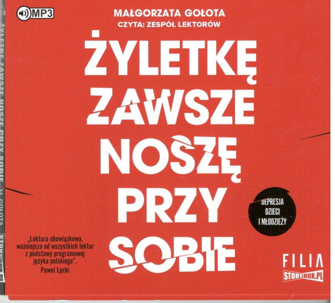 Żyletkę zawsze noszę przy sobie : depresja dzieci i młodzieży / Małgorzata Gołota ; czyta: zespół lektorów. - [Piaseczno] : Heraclon International - Storybox.pl, copyright 2022. - 1 płyta audio (CD) (7 godz. 8 min) : zapis cyfrowy, stereo ; 12 cm.
